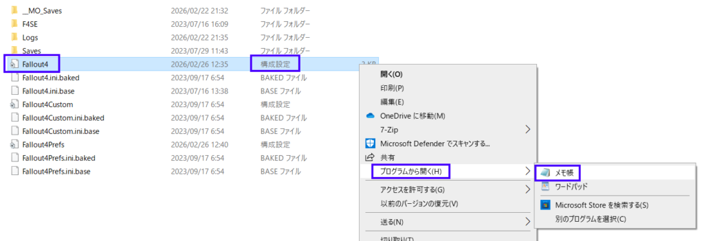 同じ場所に「Fallout4Prefs.ini」(ファイル名:Fallout4Prefs、ファイルの種類:構成設定)が入っているので、メモ帳で開きます。