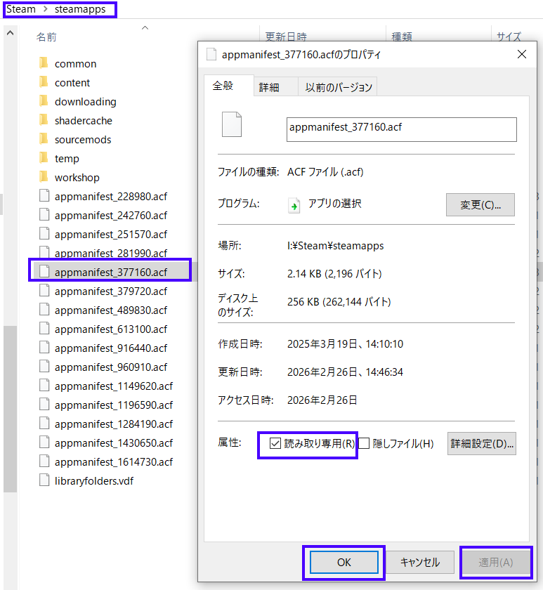 appmanifest_377160.acf」を右クリック→「プロパティ」ウィンドウが開く - 「属性」の「読み取り専用」にチェックを入れる