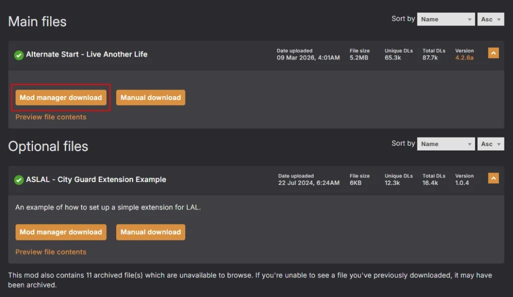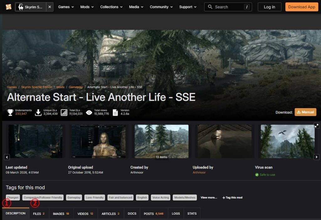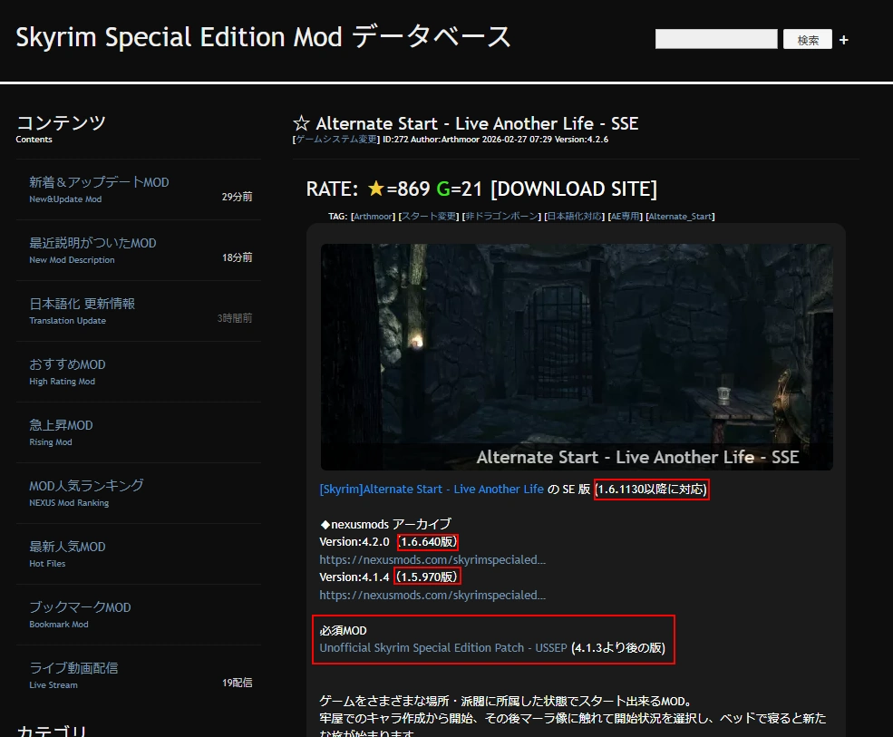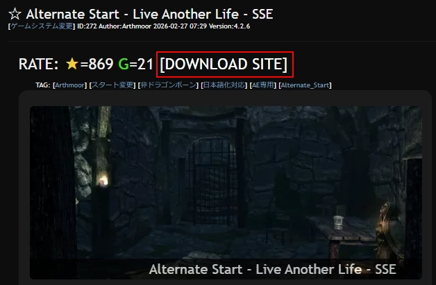 「Skyrim Special Edition Modデータベース」で「Alternate Start – Live Another Life – SSE」を見つけます。