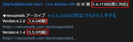 [1.6.1130]以前のゲームバージョンで遊んでいる場合は、「◆nexusmodsアーカイブ」の下に書いてある赤枠[1.6.640版]や[1.5.970版]のリンクからダウンロードする必要があります。