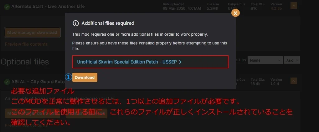 Alternate Start – Live Another Life – SSE は、必須MODとして「Unofficial Skyrim Special Edition Patch – USSEP」が挙げられている。