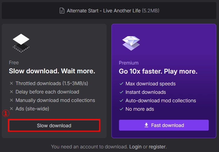 すると、次のウィンドウが開くので①[Slow download]をクリックしましょう。