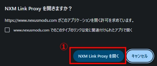 NEXUSとMO2の紐づけが済んでいれば、①[NXM Link Proxyを開く]をクリックするとMO2でダウンロードが始まります。