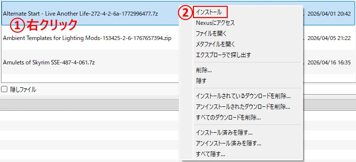 ダウンロードしたMODの上でマウスを①[右クリック]してメニューを出し、②[インストール]をクリックします。