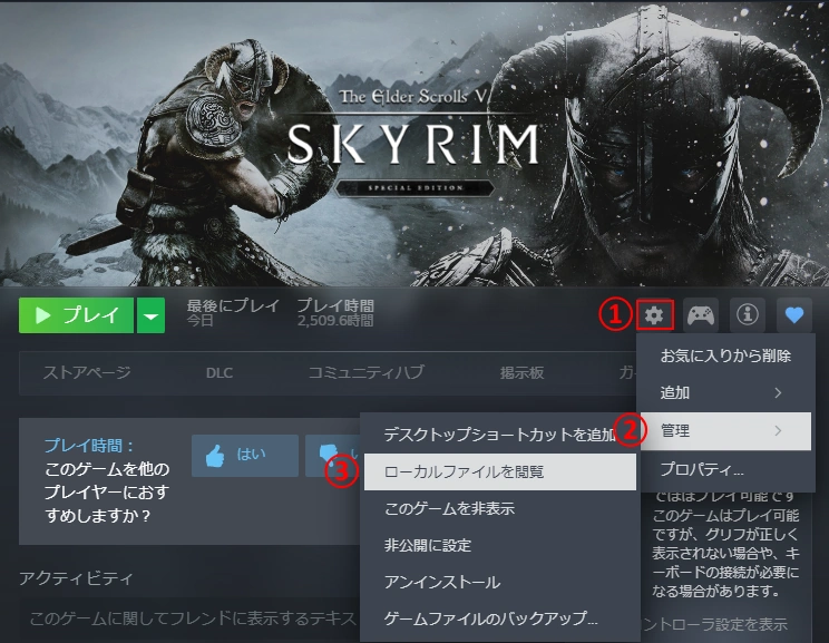 ①「歯車」マーク → ②「管理」 → ③「ローカルファイルを閲覧」 と選択します。
