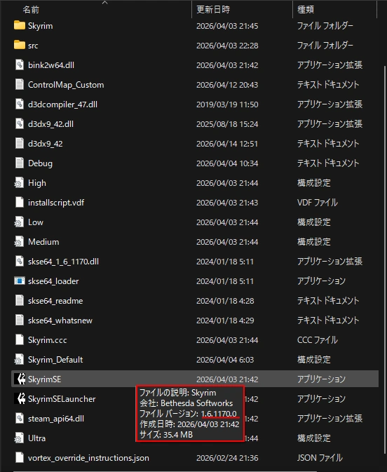 ゲームがインストールされているフォルダが開くので、[SkyrimSE](アプリケーション)を探して、その上にマウスカーソルを当ててみると、下の画像の赤枠部分が表示されます。